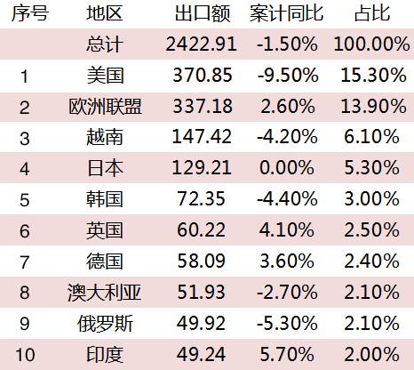 从出口地区占比来看,出口前三的是越南、巴基斯坦和韩国,三国分别占出口总量的34.4%、21.78%、7.66%,出口量同比分别增长64.44%、366.42%和17.08%。