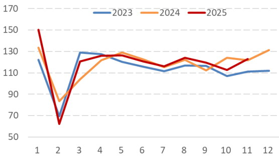 2025年10月31日印度棉花协会首次发布2025/2026年度的供需平衡表,产量预估为519万吨,同比降12万吨;出口量预估为29万吨,同比降2万吨;进口量预估77万吨,同比增7万吨;消费量为510万吨,同比降24万吨;结转库存预估159万吨,同比增56万吨,是近5年最高水平。